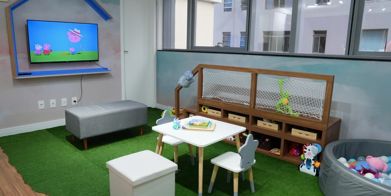 Um espaço lúdico e acolhedor, pensado especialmente para deixar as crianças à vontade e tranquilas.